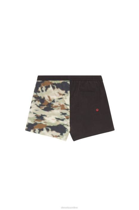 Men's mid-length swim trunks crafted from quick-dry nylon with a crinkly washed look. Their camouflage design is branded with a Diesel print on the left leg and a logo patch on the waist. Binding and rounded hem slits define the silhouette.