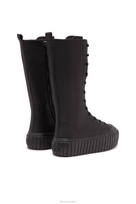 This women's boot is built from soft black leather, styled with a full lace-up closure. Set on a ridged rubber flatform sole with a rear D logo.
