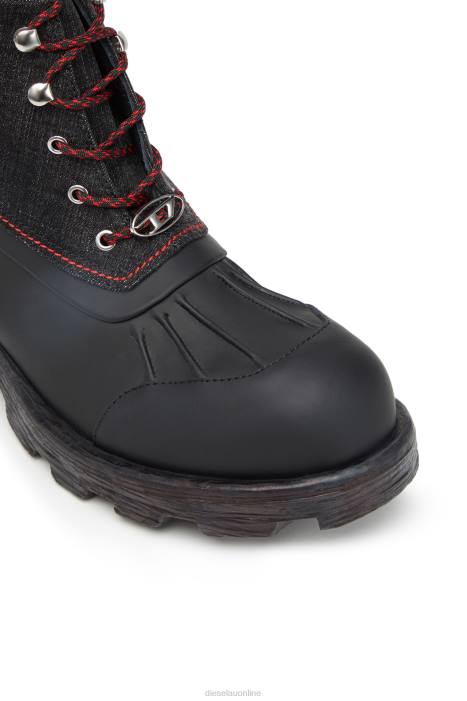 These men's black leather hiking-style boots flaunt a padded washed denim collar with contrast red stitching. Stitched pinches and rubber overlays update the silhouette, detailed with two-tone laces and a metal oval D plaque.