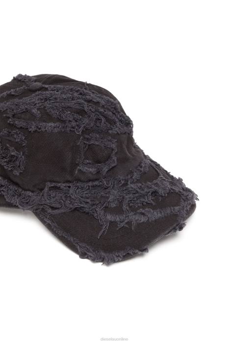Men's black baseball cap built from cotton canvas. Heavily frayed edges, creating a maxi Oval D logo motif, update the look.