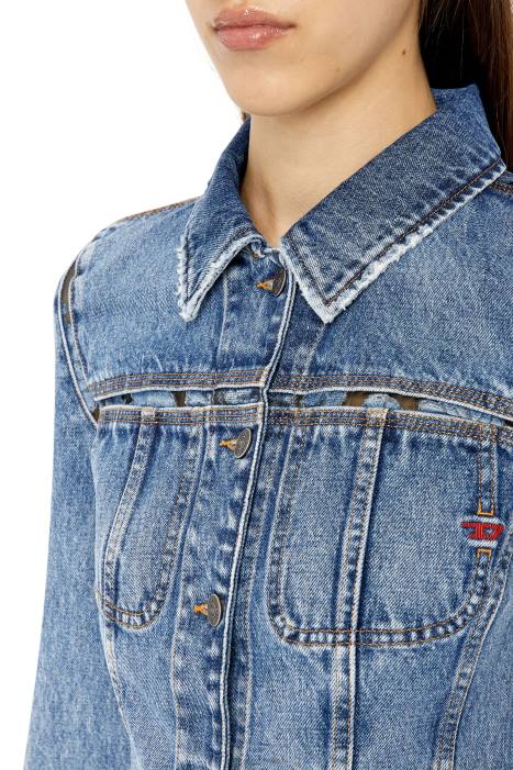 This women's denim jacket has a slim, trucker silhouette spliced with floral lace inserts along the seams. Detailed on the chest with red 'D' embroidery.