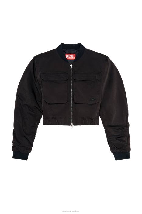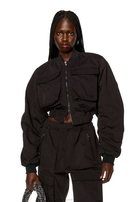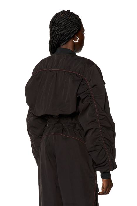 This woman's jacket features a slightly cropped bomber silhouette, crafted from nylon taslan with a soft cotton-like feel. It's lightly padded for warmth and detailed with large utilitarian pockets, one of which bears an embroidered 'oval D' logo. The sleeves have subtle gathered seams for added volume.