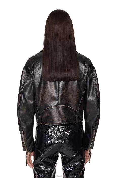 This biker jacket is crafted from treated leather that's first sprayed, then carefully distressed, revealing slivers of brown underneath. The loose silhouette features signature details and is slightly cropped in length.