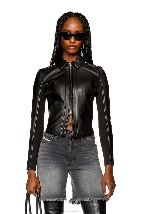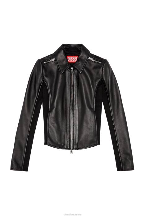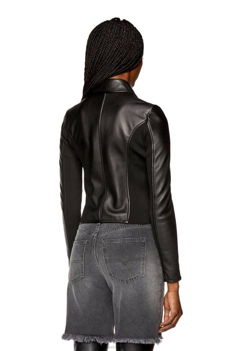 Made from supple black leather with a sleek finish, this women's biker jacket is designed with a streamlined, slightly cropped silhouette, unlined for extra lightness. Zip detailing draws the eye to the shoulders, while stretchy ribbed panels ensure a flexible fit and nod to a sporty moto aesthetic. Detailed with an embossed oval D logo on the left sleeve.