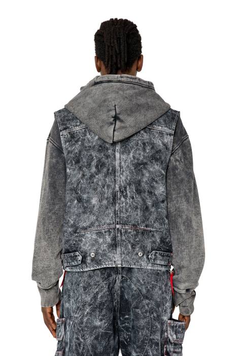 Men's cargo vest in marbled denim, featuring multiple utilitarian pockets and zip closure.