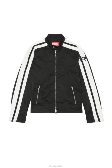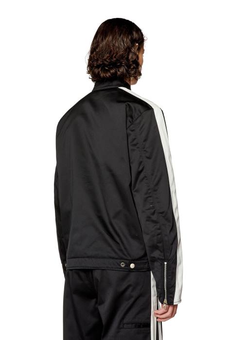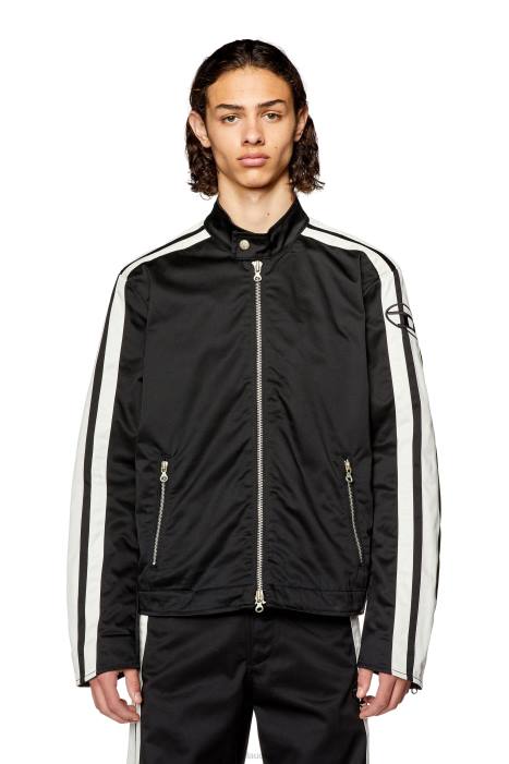This motorcycle-style jacket is made from a black techno-cotton blend, lightly padded for warmth. It's defined by contrasting white stripes along the arms, and an oval D embroidery on the left sleeve.