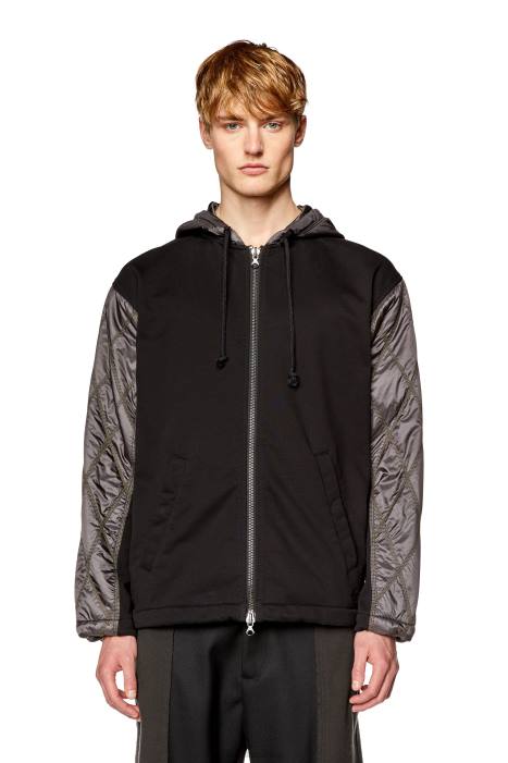 This men's jacket strikes the balance between a sweatshirt and a puffer. The zipped blouson is built from black fleece with tonal superlight quilted nylon sleeves, and a smooth nylon hood and yoke. Finished with drawstrings at the hood, cuffs and hem, and an embroidered D.IES.EL logo.