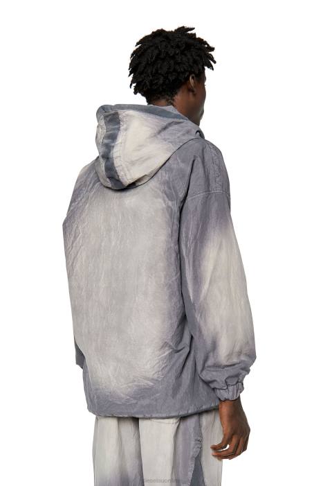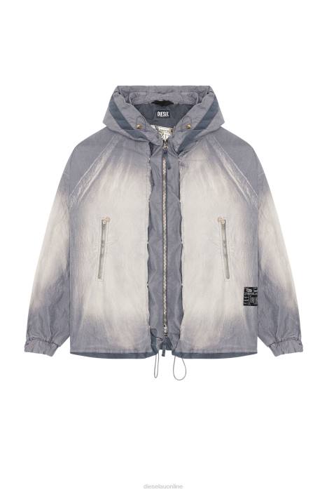 Men's grey cotton-nylon jacket from the Spring Summer 2023 Runway Show edit, styled with snap buttons and puckered ribbed inserts to create a multi-dimensional look. Once garment-dyed and stonewashed, this piece has been manually sprayed for a faded look.