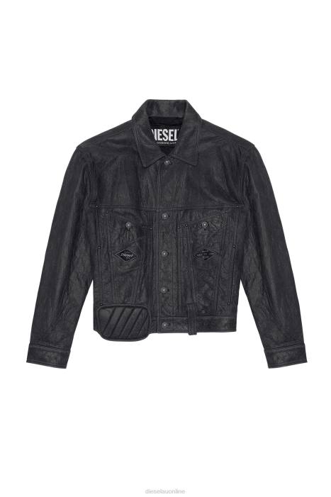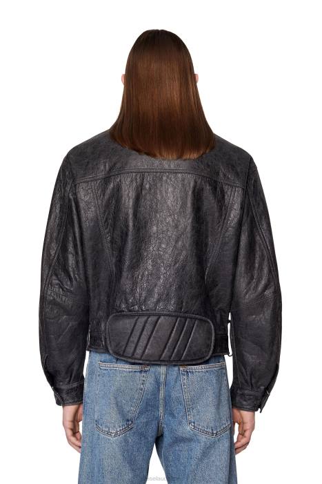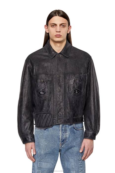 Inspired by an archival '90s piece, jacket is cut from lightly padded waxed leather that's treated to obtain a cracked appearance. The trucker-silhouette is updated with chunky, oversized belt loops and features distinctive logo inserts on the front.
