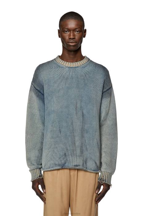 Made from indigo-dyed cotton, this loose-fit jumper has a faded blue hue and destroyed effects on the hem and cuffs. The trims have a plated knit with black yarn that enhances the stonewashed colour effects. A subtle red logo tag completes the design.