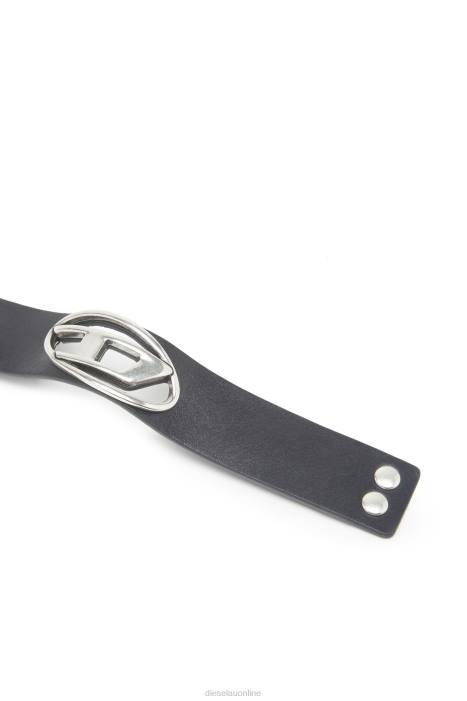 Men's cuff bracelet, crafted from soft leather. Styled with an oval cutout and metal D plaque, this accessory fastens with an adjustable snap button closure.
