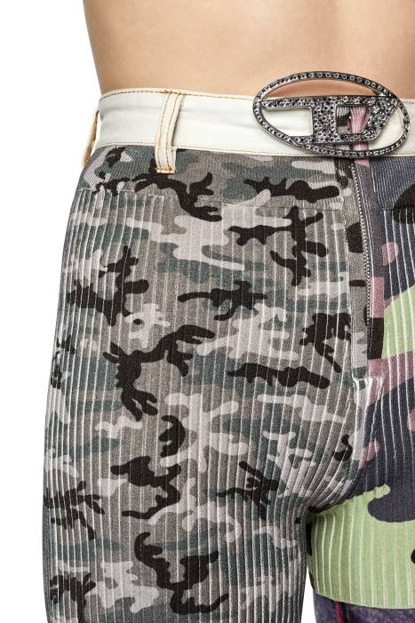 SS22 Fashion Show Collection nylon blend shorts, ribbed and plated with Lycra for a compact feel. Colour-blocked with mixed camo prints, their slim-fit profile is topped with a denim waist and rhinestone-encrusted metal 'D' plaque.