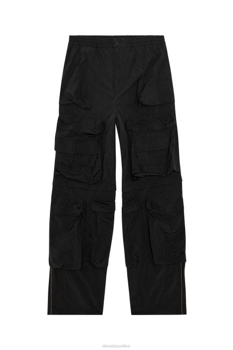 Men's loose-fit trousers built from wrinkled nylon canvas. Equipped with multiple 3D pockets and zip cuffs, these military-style trousers are embellished with an embroidered Diesel logo in tonal yarn.