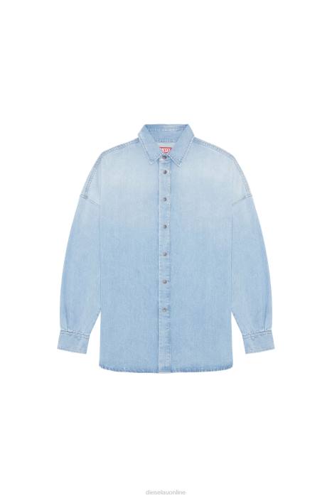 This men's denim shirt features a slightly oversized silhouette with dropped sleeves. Crafted from light blue TENCEL Lyocell denim and decorated on the back yoke with a large, super stonewashed Oval D logo patch finished with raw edges.