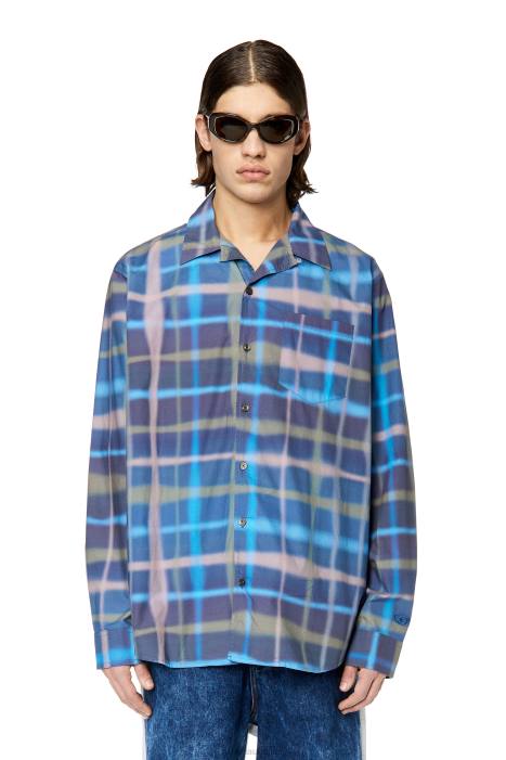 Loose-fit shirt built from high-density organic cotton poplin. This men's style is printed with a checked pattern, updated with uneven lines for a spray can effect. Finished with a washed treatment.