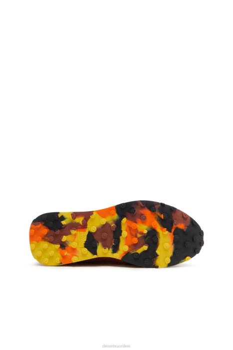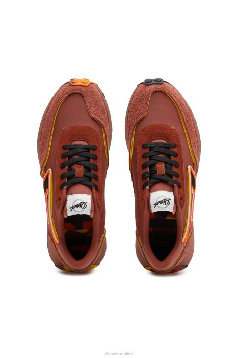 Women's sneaker inspired by '70s running styles, cut from nylon with suede inserts in an asymmetric design and unstitched contrast edges. Branded with a layered D logo and a heritage Diesel patch on the tongue, it's set on camouflage outsole.