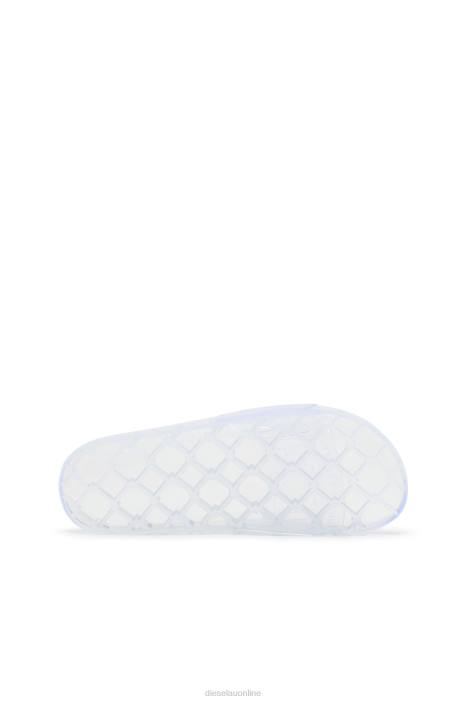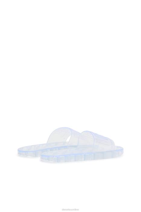 Unisex slide sandals, updated with a clear PVC construction. Maxi embossed Diesel lettering embellishes the strap.
