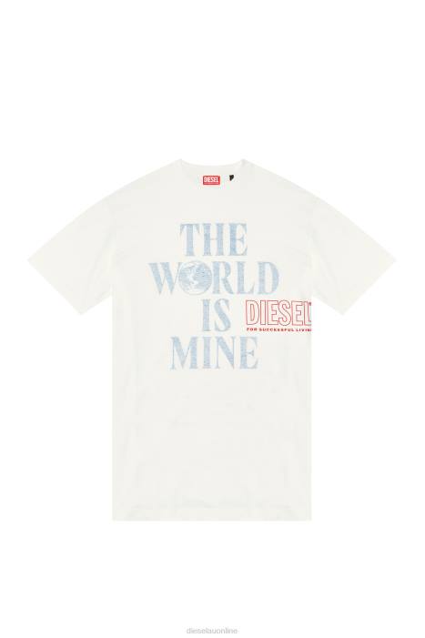 This men's loose-fit tee is built from white raw-feel cotton with a vintage look and substantial feel. 'The World Is Mine' is printed on the inside to achieve a faded look, whilst the Diesel outline lettering stands out with a puffy finish.
