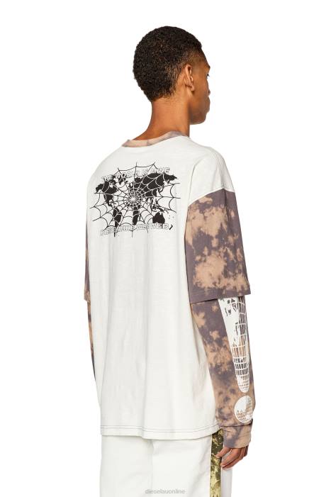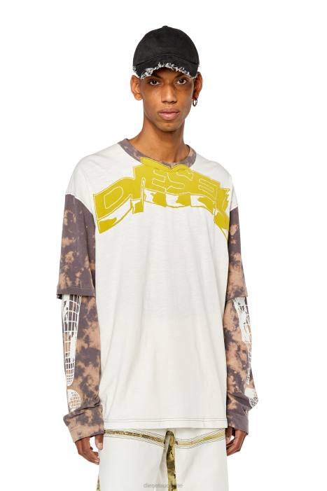 Men's white loose-fit tee built from slub cotton jersey, styled with layered sleeves that are specially treated for a marbled effect. Printed with puffy Diesel lettering on the front and globe graphics on the back and sleeve.