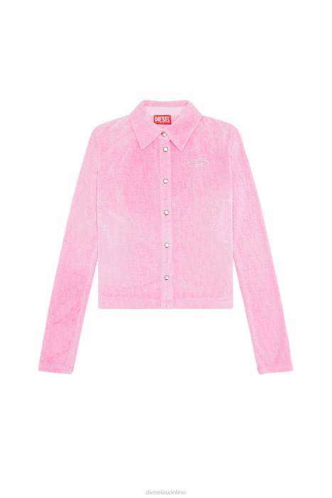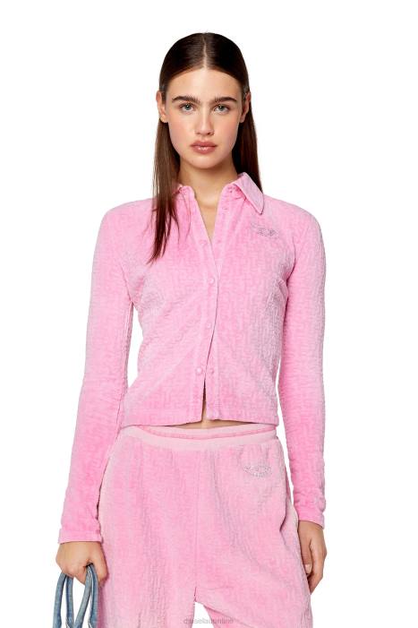 Women's long sleeve shirt in plush jacquard chenille, spun with a tactile Diesel monogram logo. It's sprayed all-over to create a nuanced light and shadow effect for a natural vintage look. The long-sleeve silhouette is cut for a close fit, with metal snap buttons and a rhinestone oval D logo on the chest.