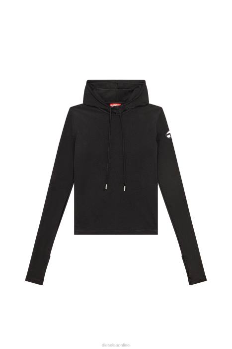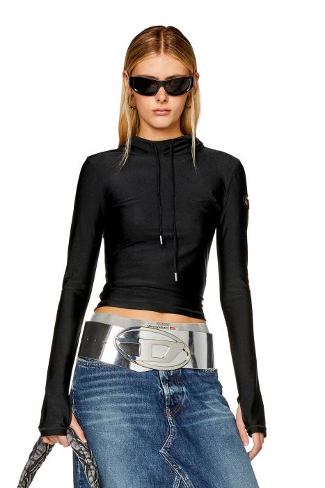 This women's hoodie is styled for a slim fit from ultra-shiny stretch nylon jersey. A cut-out with embroidered oval D on the sleeve creates a peek-a-boo effect.