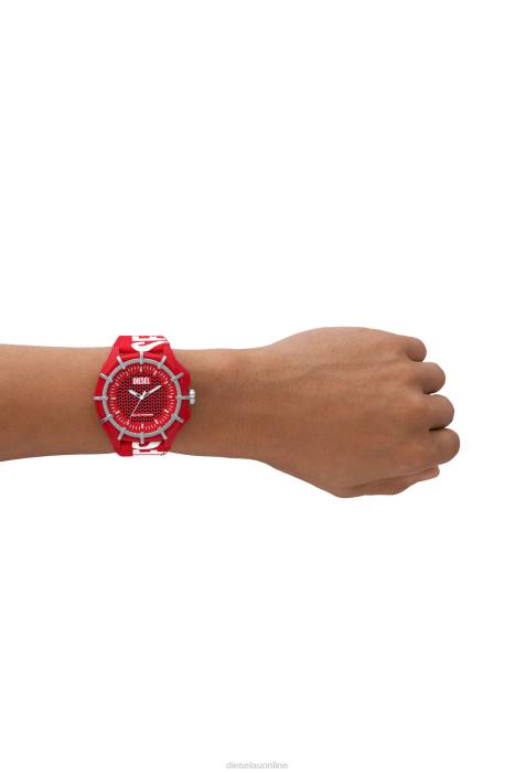 Diesel's 51mm Framed watch is powered by three-hand solar movement. It features a red brushed dial and straps made with #tide ocean material and cases made with 45% bio-based castor oil. #tide ocean material is a premium quality recycled plastic material made of 100% ocean-bound plastic.